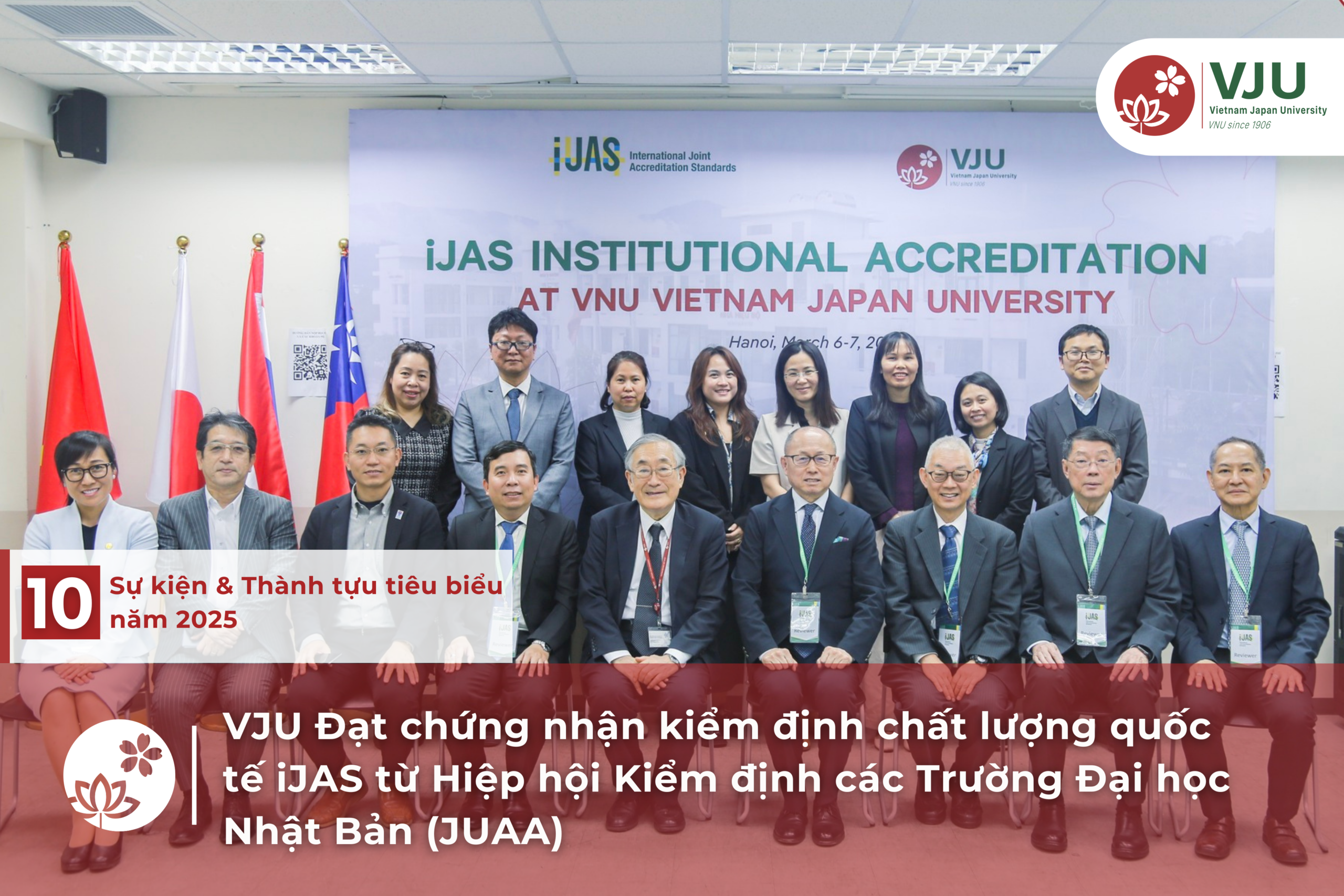 Sau hơn 10 năm phát triển, Trường Đại học Việt Nhật tiếp tục nâng cao vị thế trong hệ thống giáo dục đại học khu vực và thế giới thông qua việc đạt chuẩn kiểm định quốc tế iJAS. Đây là minh chứng về năng lực học thuật, hệ thống quản trị hiệu quả và cam kết xây dựng môi trường giáo dục hiện đại, bền vững. Dấu mốc quan trọng này mở ra nhiều cơ hội hợp tác quốc tế cho sinh viên và giảng viên Nhà trường.