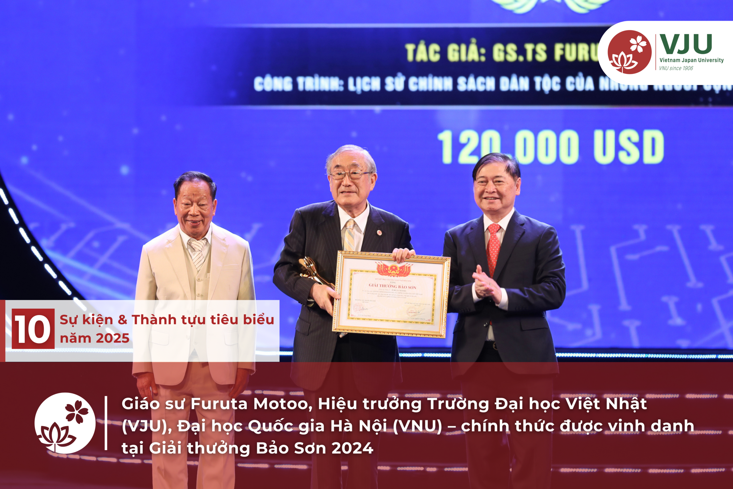 GS. Furuta Motoo, Hiệu trưởng Trường Đại học Việt Nhật, ĐHQGHN, được vinh danh tại Giải thưởng Bảo Sơn 2024, một trong những giải thưởng danh giá nhất Việt Nam trong lĩnh vực khoa học và giáo dục.
