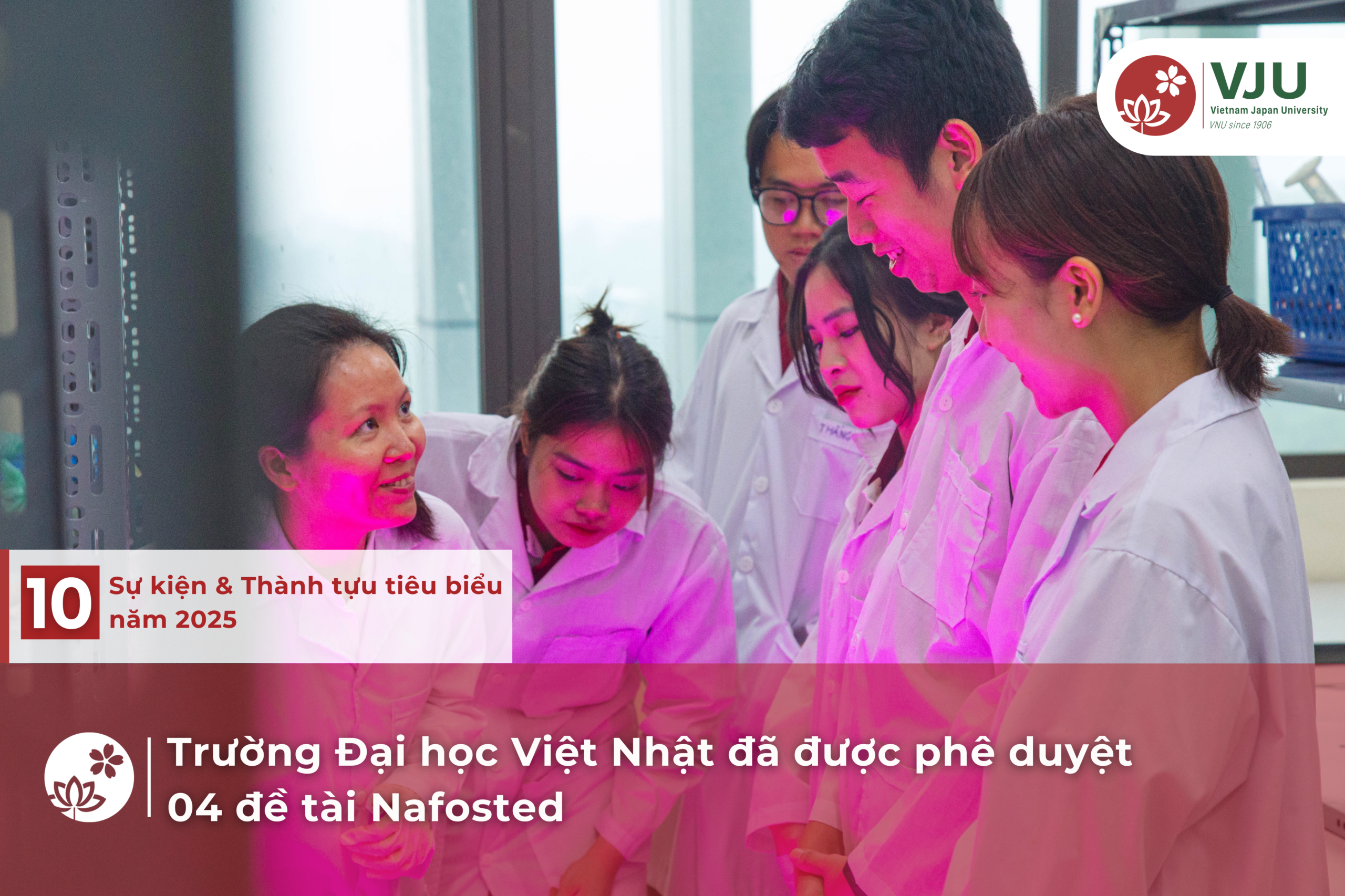 Trong tháng 11/2025, Trường Đại học Việt Nhật đã được phê duyệt 04 đề tài Nafosted, trong đó: 02 đề tài nghiên cứu phát triển với mỗi đề tài kinh phí trên 03 tỉ đồng và 01 đề tài nghiên cứu thăm dò với kinh phí 1,8 tỷ đồng và 01 đề tài ứng dụng với kinh phí trên 3 tỷ đồng.