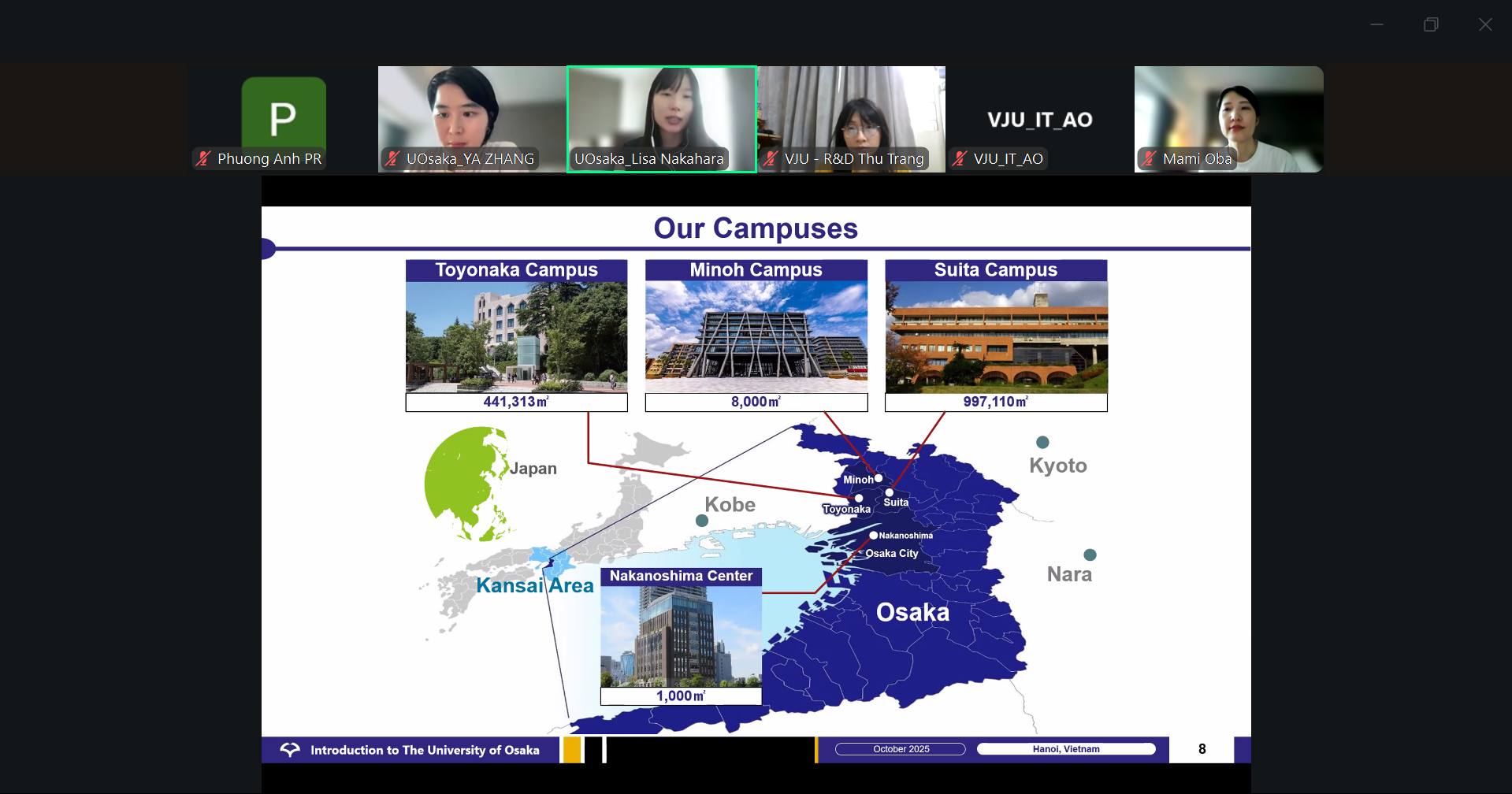 Đại học Osaka, ngôi trường vừa nhận tin vui từ Giải Nobel Y sinh danh giá, đã có buổi giới thiệu về các cơ hội học tập dành cho sinh viên quốc tế với Trường Đại học Việt Nhật (VJU), ngày 7/10. Dù phải chuyển sang hình thức trực tuyến do tình hình ngập úng tại Hà Nội, sự kiện vẫn diễn ra trong không khí sôi nổi.