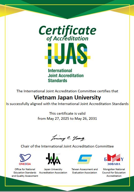 iJAS là bộ tiêu chuẩn kiểm định chung do các tổ chức kiểm định uy tín châu Á, gồm JUAA (Nhật Bản), TWAEA (Đài Loan), ONESQA (Thái Lan) và MNCEA (Mông Cổ), xây dựng. Hệ thống kiểm định này được quốc tế công nhận và đánh giá khắt khe, toàn diện theo 6 tiêu chí: mục tiêu đào tạo, đảm bảo chất lượng nội bộ, giảng dạy và học tập, đội ngũ giảng viên, kết nối xã hội, vận hành.