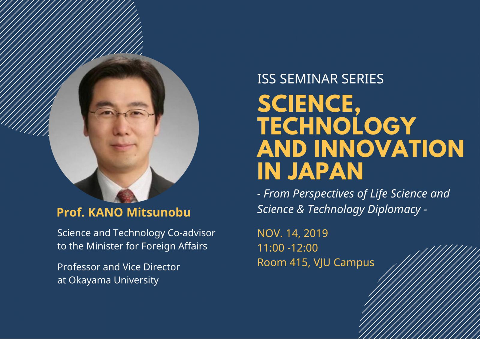 Prof. KANO Mitsunobu is science and technology co-advisor to the Minister for Foreign Affairs from April 2019. Concurrently, he is Professor and a Vice Executive Director at Okayama University.