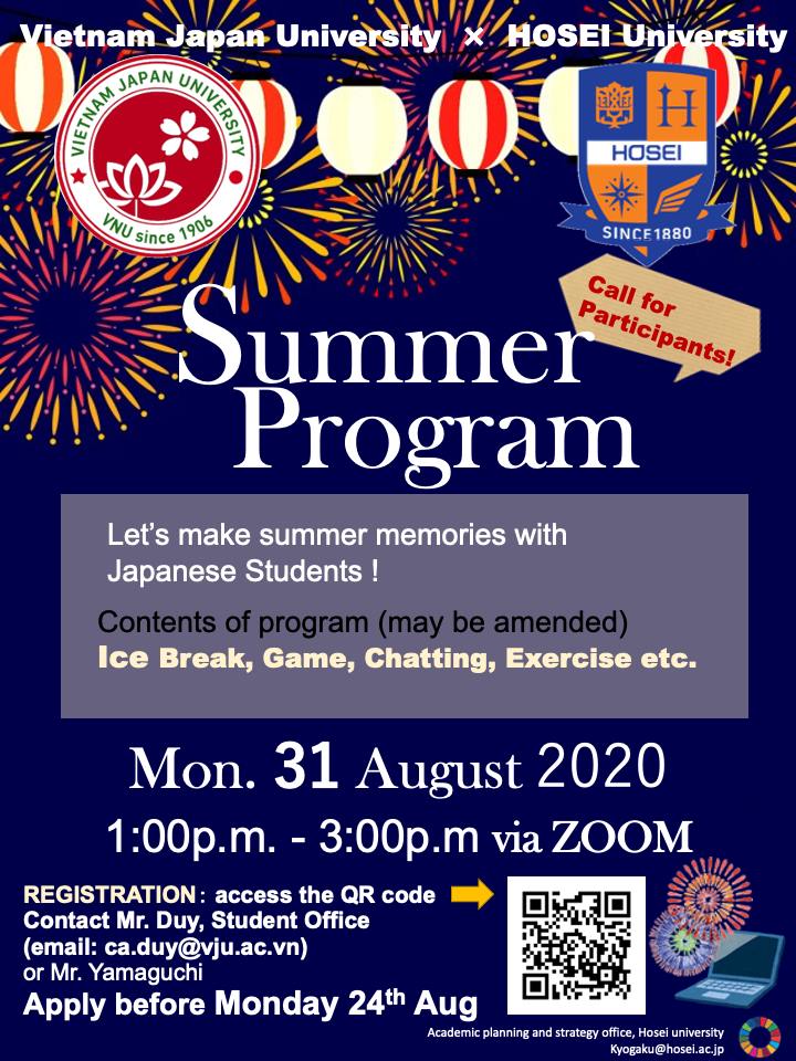Trường Đại học Việt Nhật trân trọng kính mời các bạn tham gia chương trình trao đổi trực tuyến Summer Program được tổ chức vào ngày 31/08/2020.