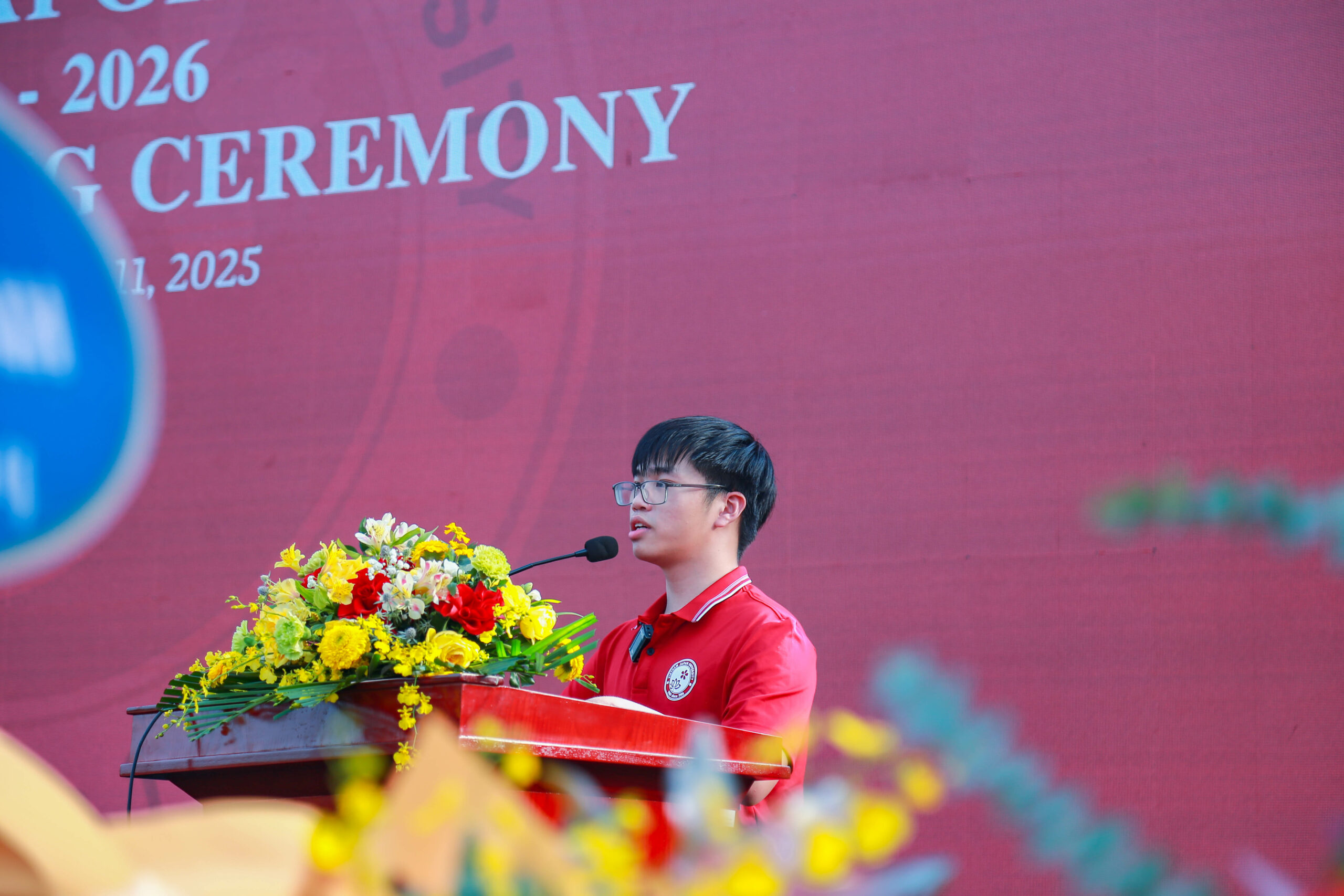 Cảm ơn những chia sẻ đầy cảm hứng từ thầy Hiệu trưởng, sinh viên Phạm Lê Bảo, thủ khoa đầu vào ngành Cơ điện tử thông minh và sản xuất Nhật Bản (MJM), bày tỏ tự hào khi được học tập trong môi trường giao thoa tri thức, văn hóa của hai nước Việt Nam – Nhật Bản. Cũng trong bài phát biểu, Bảo kể rằng những bỡ ngỡ ban đầu khi rời TP.HCM ra Hà Nội đã được xoa dịu bởi sự thân thiện và ấm áp của thầy cô, bạn bè tại VJU, khiến Bảo càng thêm vững tâm trên hành trình học tập và chinh phục ước mơ của mình.