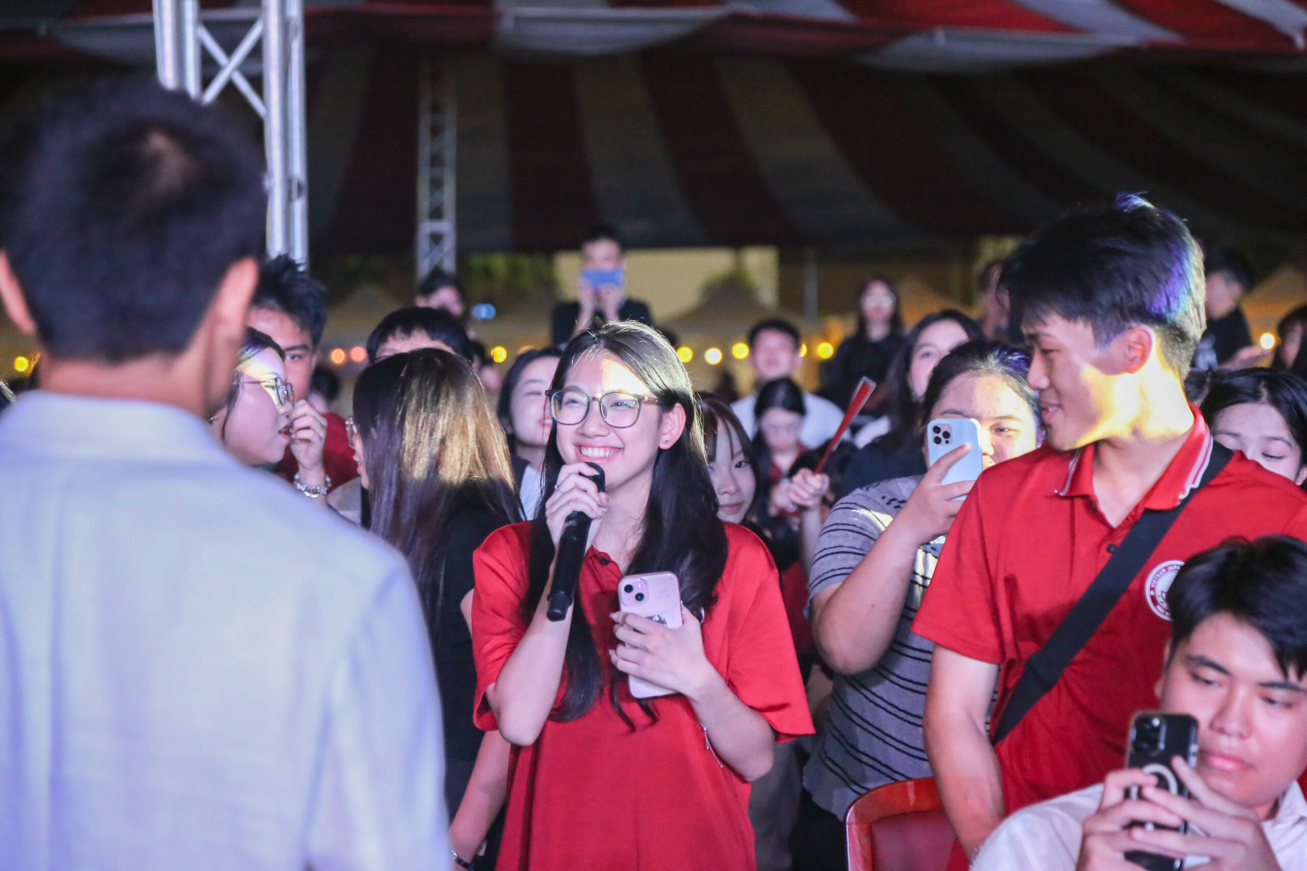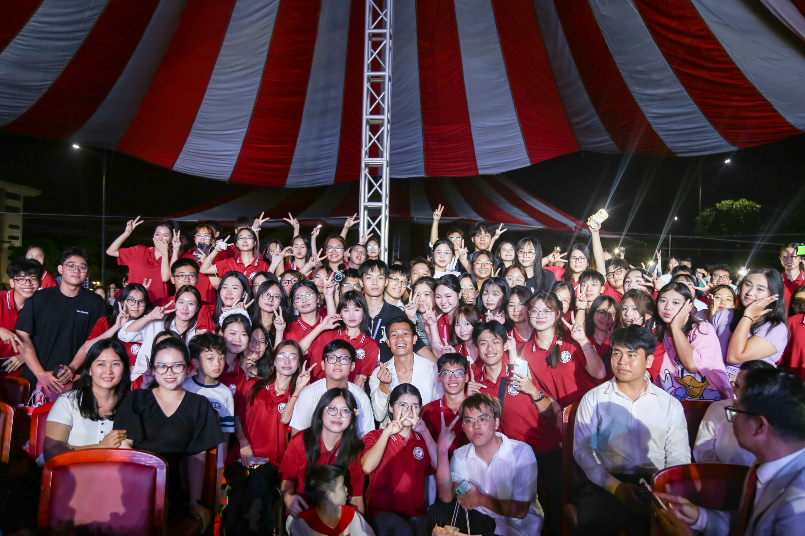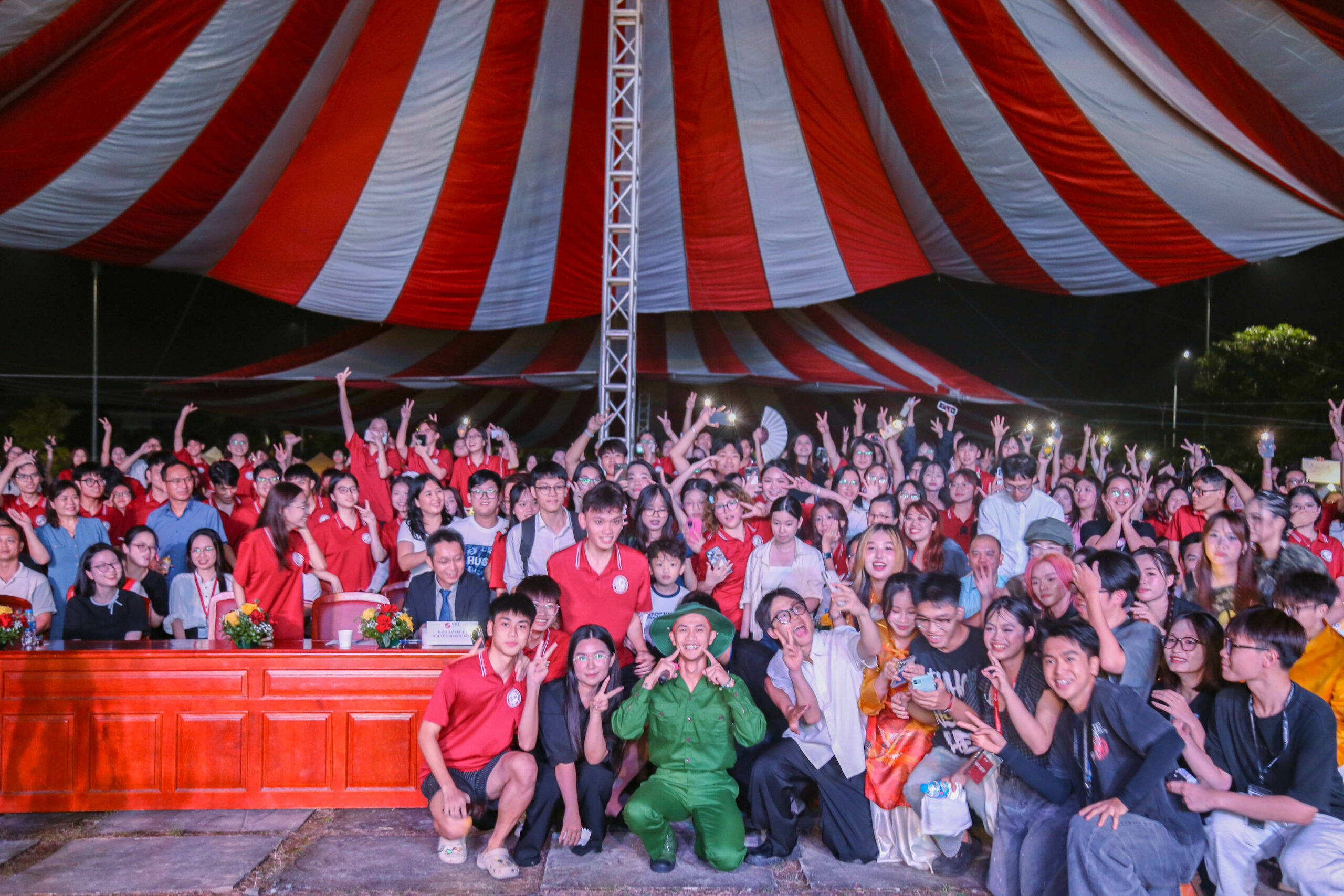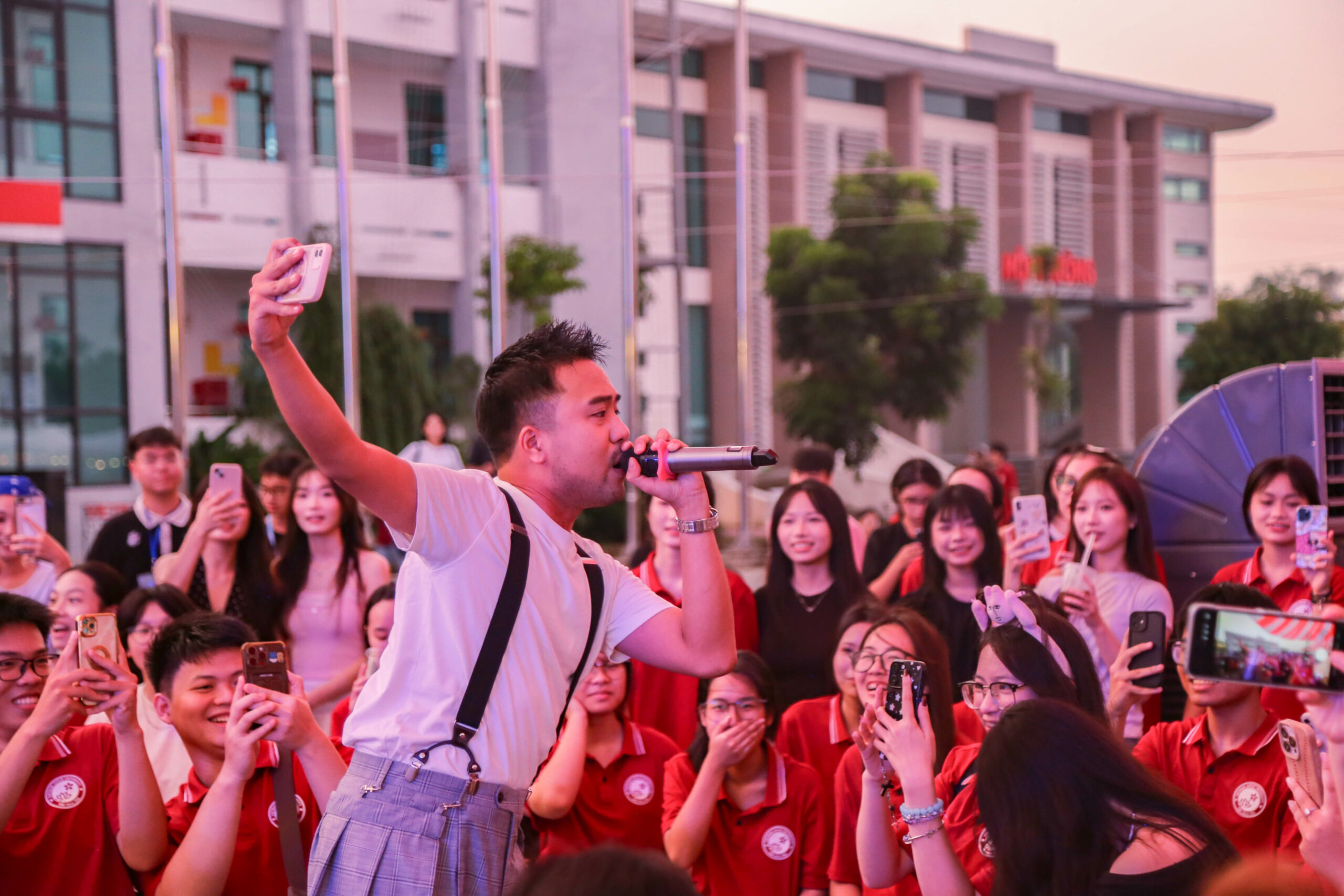 Tiếp ngay sau đó là chương trình Chào tân sinh viên năm 2025 với sự có mặt của dàn nghệ sĩ khách mời gồm ca sĩ Nguyễn Hùng, diễn viên Phương Nam, rapper Rica, DJ Judy và MC Minh Hiếu. Bầu không khí nhanh chóng trở nên vô cùng sôi động, trẻ trung và đầy năng lượng, xen lẫn những giây phút lắng đọng khi sinh viên lắng nghe “anh Tạ” chia sẻ chân thành về quá trình thực hiện bộ phim Mưa đỏ – bộ phim mà nhiều sinh viên cho biết đã xem đi xem lại, và mỗi lần xem đều cảm nhận trọn vẹn lòng xúc động và biết ơn.