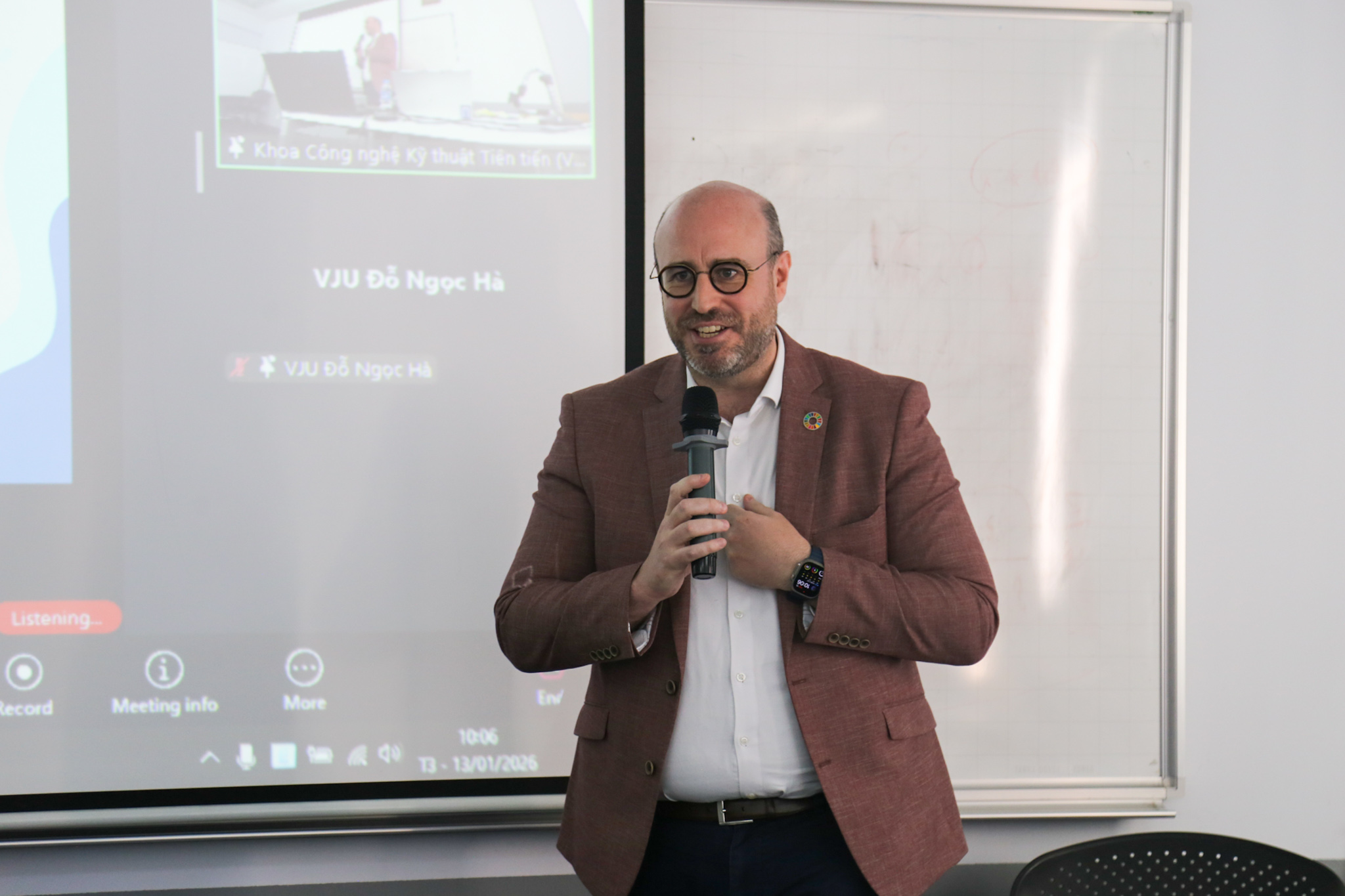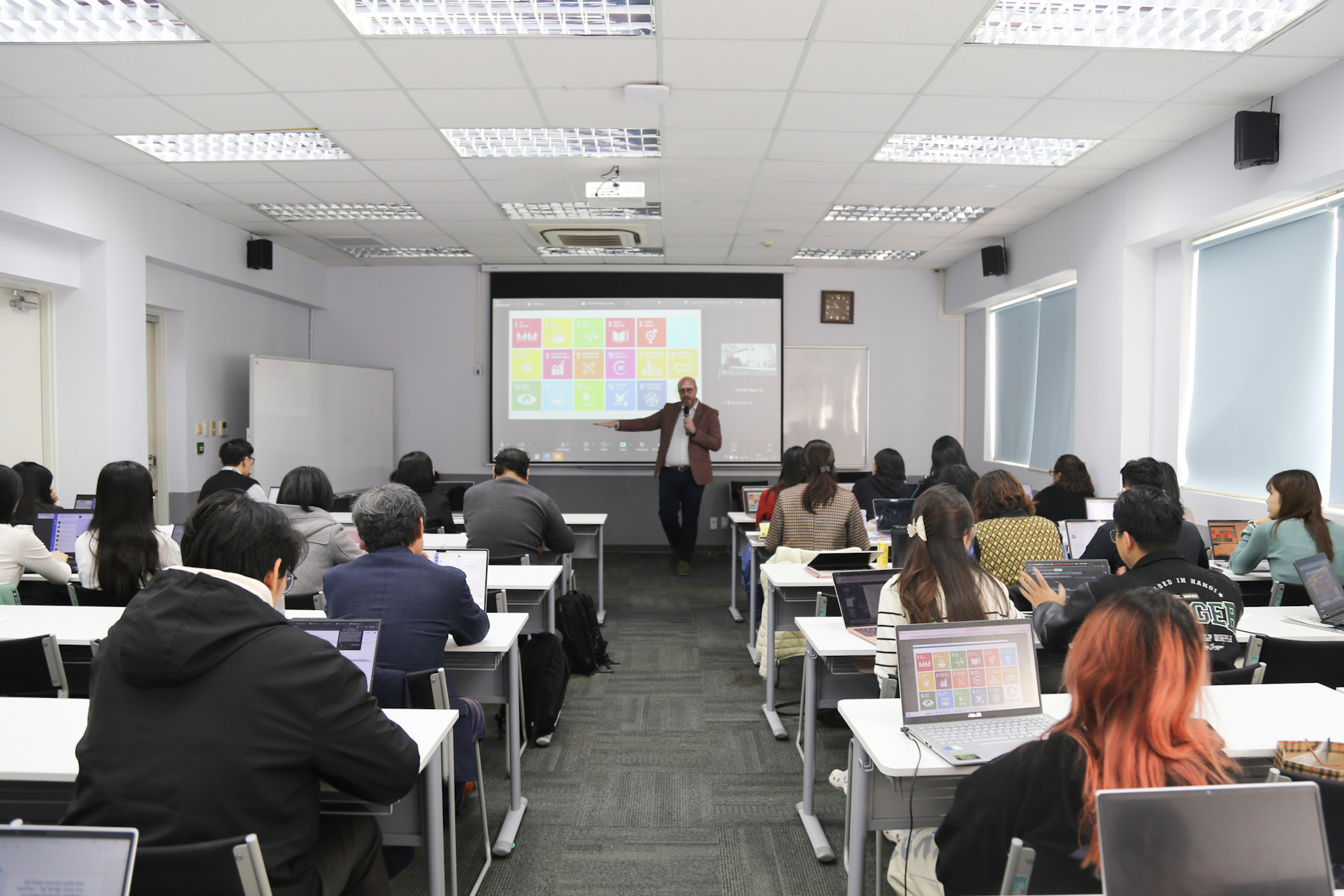 Sáng 13/1, tại Trường Đại học Việt Nhật cơ sở Mỹ Đình, các học viên cao học đã tham dự seminar về vai trò của quản trị y tế trong việc thúc đẩy các mục tiêu phát triển bền vững (SDGs) do TS. Chris McBrearty – Chuyên gia Quản trị Y tế của UNDP Vietnam và WHO Vietnam – trình bày. Đây là hoạt động nằm trong học phần Cơ sở Khoa học bền vững, với sự tham gia của người học đến từ Việt Nam, Nhật Bản, Nigeria và Myanmar.