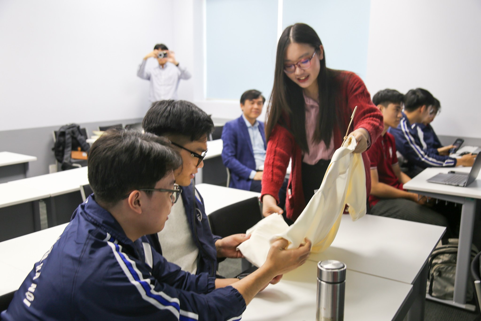 Những nội dung này đã thu hút sự chú ý lắng nghe của các bạn sinh viên MJM từ những phút đầu tiên của buổi học. Các bạn cũng rất hào hứng được tận tay cảm nhận các sản phẩm vải, quần áo được làm từ loại sợi kể trên.